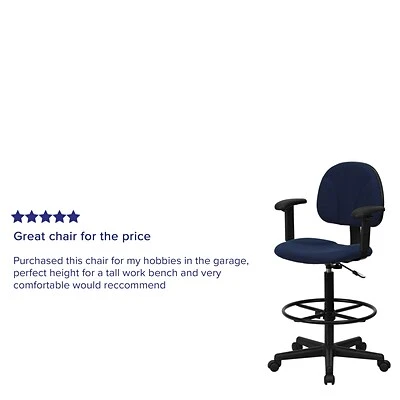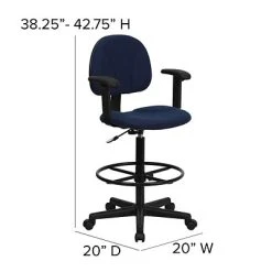 The Flash Furniture fabric ergonomic drafting stool is a mobile and adjustable chair that accommodates persons of different body lengths comfortably at the drafting table or countertop. The padded, fabric-upholstered ba ck rest is equipped with a tension adjustment knob that tightens or loosens the accordion-wrapped support stem according to desired posture, and the armrests raise or lower in a 3-inch range. The twin-wheel casters let the Flash furniture small-back erg onomic stool glide smoothly between workstations.Adaptable Height
