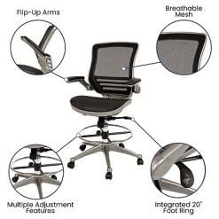 When you spend more time at your desk than anywhere else it’s time to invest in a top-notch chair. This high quality drafting chair is constructed with a higher seat range to reach counters and bars. Featuring breathable mesh material and extra padding throughout, this drafting stool will keep you cool and comfortable. Our adjustable-height drafting chair effortlessly raises and lowers via an easy-to-operate pneumatic adjustment lever while the integrated chrome foot ring provides a comfortable place for your feet to rest. The waterfall front seat edge helps reduce pressure on the lower legs. Padded armrests flip up and out of the way. Synchro-tilt control lets the chair’s seat and back recline at different rates and the contoured back with lumbar support may help to alleviate strain. 360 degree swivel paired with dual-wheel casters allows you effortless mobility. Spills clean up easily with a solvent based cleaner, no water required.