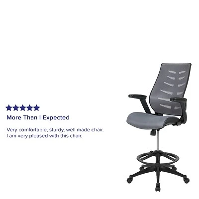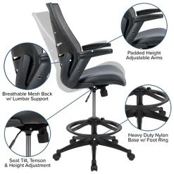 Make your daily tasks at work more pleasant with a high office chair designed especially for your high desk table needs. This tall task chair is ideal at sit-to-stand desks, standing desks, bar height tables and drafting tables. This mesh back drafting chair will make your receptionist’s desk look professional as visitor’s are being greeted. Enjoy the comforts of an ergonomic chair in a taller frame to meet the needs of students and professionals working at above average desk heights. No more miserable summer days at work when you have a mesh back office chair that’ll keep airflow circulating. The curved high back cradles you while offering built-in lumbar support.