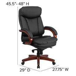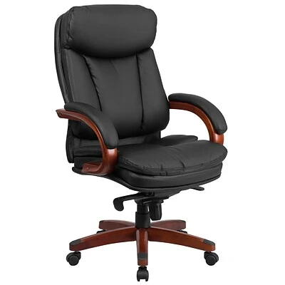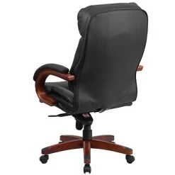 Manage your entire office from the comfort of this Flash Furniture executive swivel chair. The high back and pillow-top headrest let you lean back and take stock of the day’s work, while built-in lumbar support cradles your back through marathon conference calls and client meetings. A dual-paddle control system offers effortless adjustments for a more customized seating arrangement. Pneumatic height adjustment moves the plush, padded seat up and down, and two-to-one locking synchro-tilt adjustment makes it easy to find the perfect angle to recline back and relax. Featuring luxurious LeatherSoft upholstery and rich mahogany-finish accents, this Flash Furniture executive swivel chair delivers upscale style.