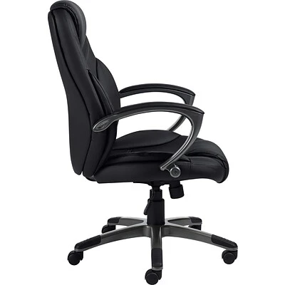 It’s rated to hold up to 250 pounds comfortably and safely for an entire work day. A 4-inch variable pneumatic height adjustment allows workers to set it to the most efficient setting for maximum productivity. This Global bonded executive office chair has thick armrests that remain at a fixed level for support and ensure proper positioning when working at a desk.