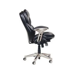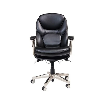 Work in style and comfort in this office chair featuring Active Seating Technology. This mid-back chair boasts an ergonomic design that delivers support where needed, and the pneumatic lift features adjustable tension and lock-out functionality for personalized seating. Side levers allow for convenient customization for height and tilt adjustments. This chair delivers soft support with body cushions that gather in their centers to enhance the plush experience. A heavy-duty frame with five easy-glide casters makes it easy to move from the printer to your desk and back again. This Serta Back-in-Motion office chair features black leather that is eco-friendly and sumptuously soft.