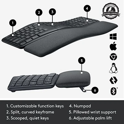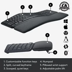 ERGO K860 for Business is a science-driven ergonomic keyboard with a curved, split keyframe and a fluid, ultra-precise typing experience. The included palm rest provides 54%* more wrist support and is proven to reduce muscle activity by 21%* in the upper trapezius muscle. This keyboard is uniquely designed for hours of comfortable typing.