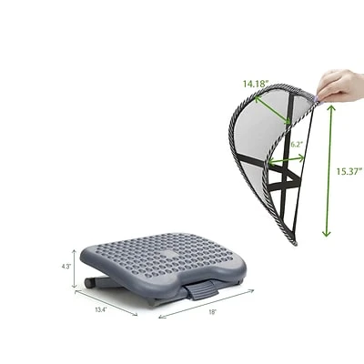 Back Support Dimensions: 14.18 (L) x 15.37 (W) x 6.12 (H); Foot Rest Dimensions: 13.4 (L) x 18 (W) 4.3 (H)